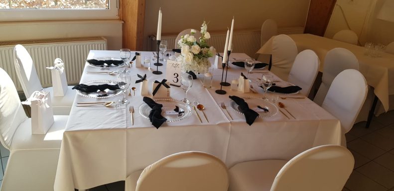 Stellen Sie sich vor, wie Ihre ganz persönliche Feier in einer einladenden und gemütlichen Atmosphäre Gestalt annimmt. Als Inspiration zeigen wir hier beispielhaft eine Hochzeitsfeier – doch unsere Räumlichkeiten bieten den idealen Rahmen für viele unterschiedliche Anlässe: von Familienfeiern über Geburtstage und Jubiläen bis hin zu Firmenveranstaltungen oder Vereinsfesten.
