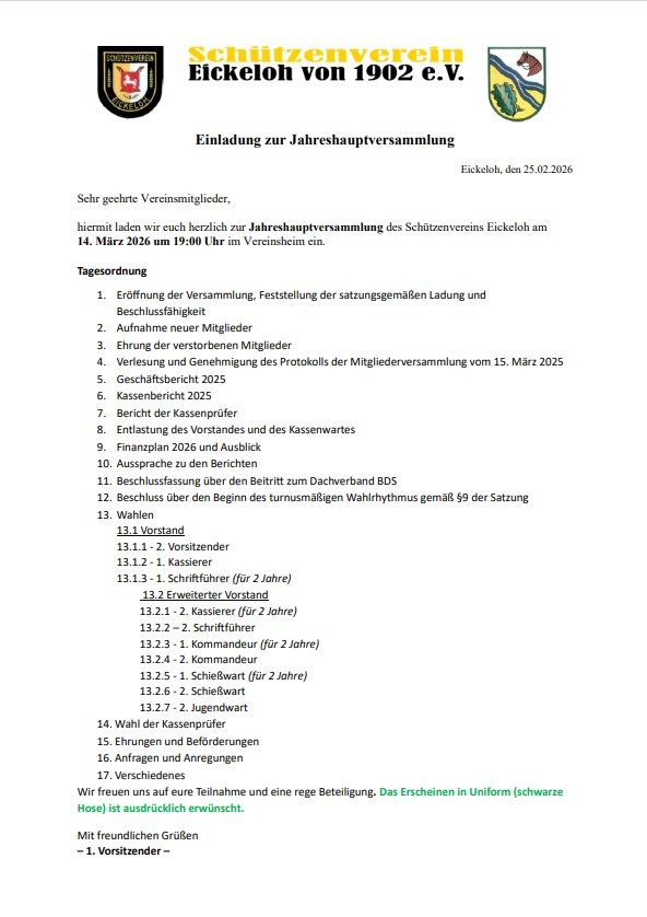 Der Schützenverein Eickeloh bedankt sich herzlich bei allen Sponsoren und Spendern, die mit attraktiven Preisen und großzügiger Unterstützung zum Gelingen der Veranstaltung beigetragen haben. Ein besonderer Dank gilt zudem den zahlreichen Helferinnen und Helfern, die mit ihrem ehrenamtlichen Einsatz für Organisation, Theke, Auswertung und Aufbau sorgten. Ihr Engagement zeigt eindrucksvoll, wie wichtig das Ehrenamt für das Vereinsleben und den gesellschaftlichen Zusammenhalt in der Region ist.